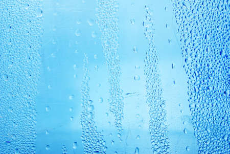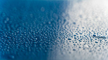 Blue and purple water drops on the glass, abstract background, large and small drops. Space for text