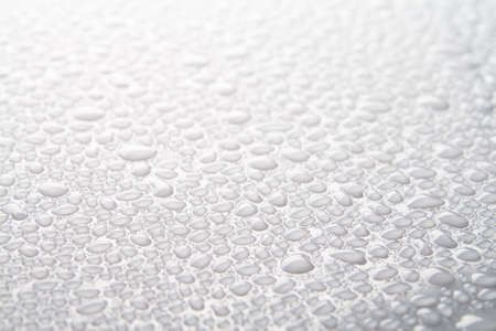 Close up of water drops on smooth surface, gray background
