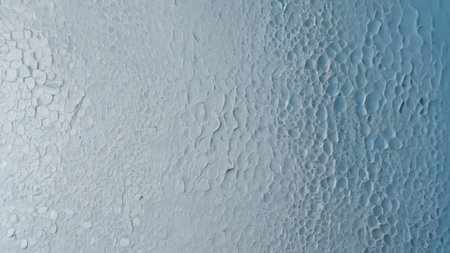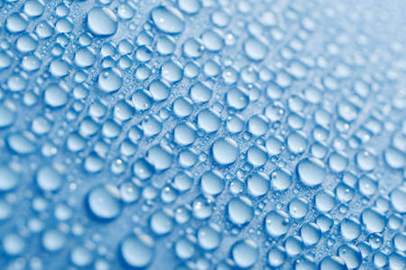 Close up of water drops on smooth surface, blue background