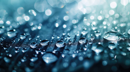 a close-up view of numerous water droplets scattered across a smooth, vibrant blue surface. The droplets vary in size, with some larger ones prominently displaying spherical shapes and clear reflections of light. The background is a soft gradient of cyan and teal, creating a sense of depth and tranquility. The lighting highlights the transparency and purity of the water, emphasizing its refreshing and clean qualities. The overall impression is one of natural beauty and simple elegance,...