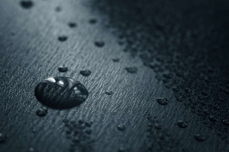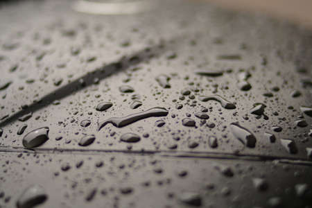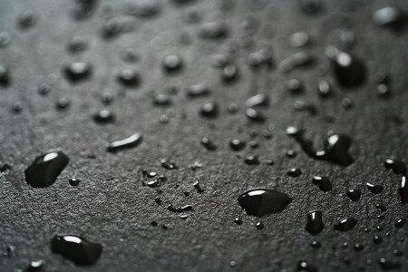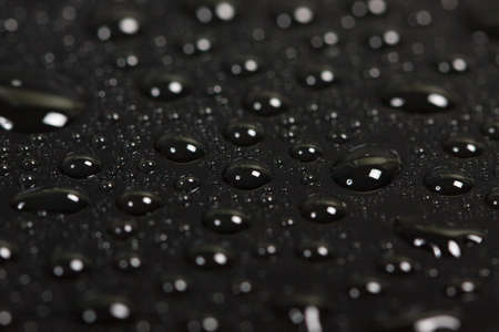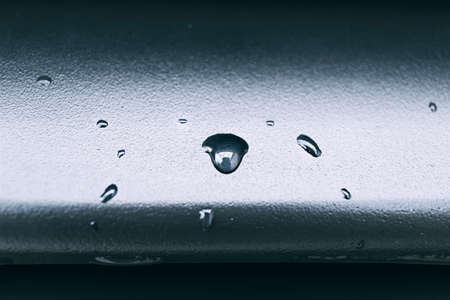 Water droplets on the metal surface in black color in close-up view, selective soft focus.