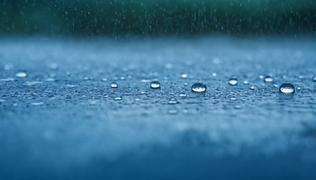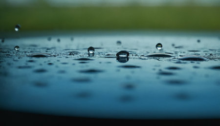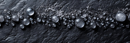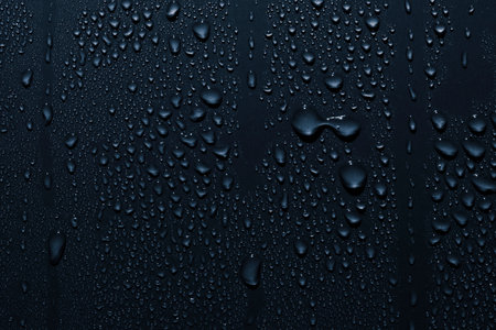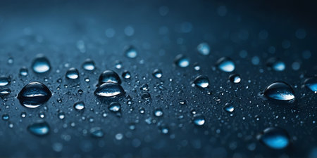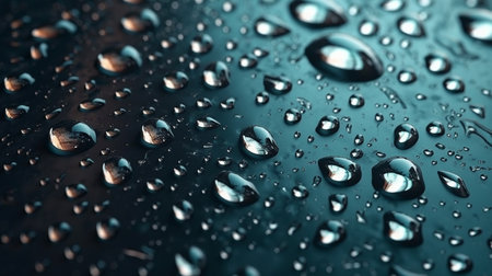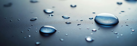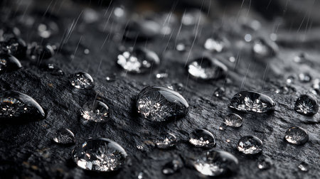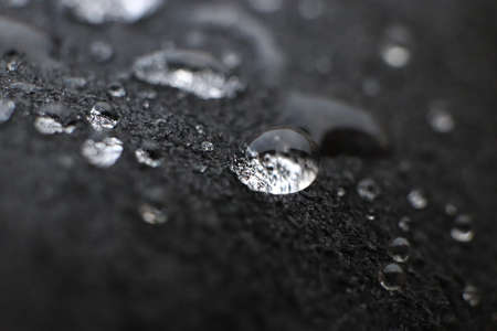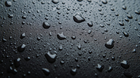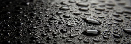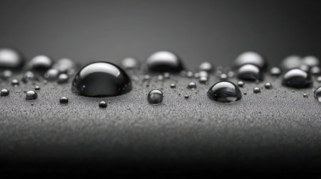 Glistening water droplets resting on a dark, non absorbent surface highlight the intriguing properties of water resistance and hydrophobicity, creating a captivating visual effect