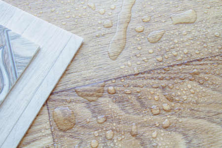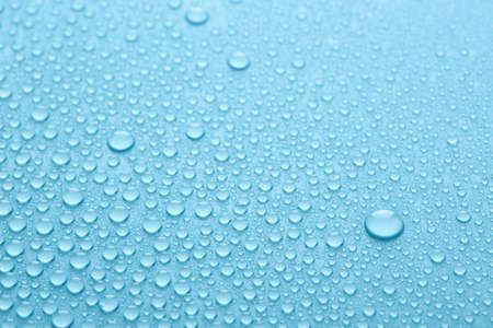 Beauty of nature, weather concept. Detailed closeup of water drops on light blue wooden board