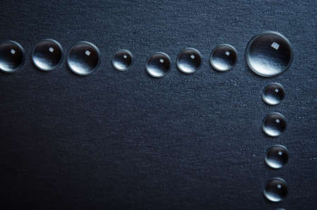 A macro, close-up shot focuses on numerous clear water droplets scattered across a dark, textured surface. The lighting is dramatic, creating strong highlights and reflections on the rounded surfaces of the droplets. The dark background and the glistening water create a visually striking contrast. The texture of the surface beneath the water is subtly visible, adding depth to the composition. evokes a sense of purity, coolness, and detailed natural beauty.