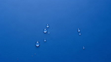 Several clear, spherical water droplets are scattered across a vibrant, textured blue surface. The droplets are distinct and well-defined, with visible highlights and refractions that showcase their transparency and the glossy nature of their surface. The blue background has a subtle texture, preventing it from being a flat color and adding visual interest. The composition is clean, minimalist, and evokes a sense of freshness, purity, and hydration. The is as a background or for themes...