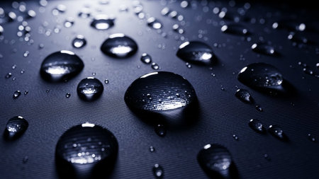 Hydrophobic fabric repelling water in perfect bead formations, macro science aesthetic.