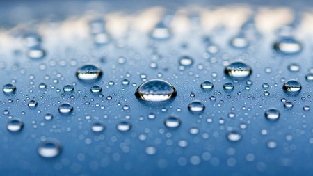 A macro captures a multitude of clear, spherical water droplets scattered across a textured blue surface. The droplets vary in size, from tiny specks to a larger, prominent drop in the center, each reflecting light and the surrounding environment. The blue surface has a subtle texture, providing a cool and clean backdrop for the glistening water. The shallow depth of field draws attention to the central droplets, highlighting their clarity and the way light passes through them. evokes a...