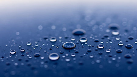 A macro close-up reveals numerous clear water droplets scattered across a dark blue surface. The spherical droplets are sharply in focus, showcasing their transparency and the subtle reflections of light on their surfaces. The background is softly blurred with a bokeh effect, creating an abstract and visually appealing texture. The conveys a sense of freshness, purity, and the intricate beauty of water in its liquid form.