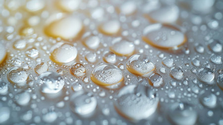 This image showcases a collection of water droplets resting on a smooth surface, illuminated by soft light, creating a calming and refreshing atmosphere.