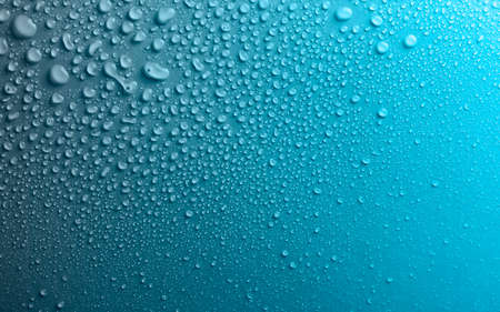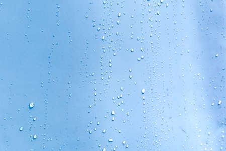 Rain droplets on blue glass background, Water drops on blue glass.