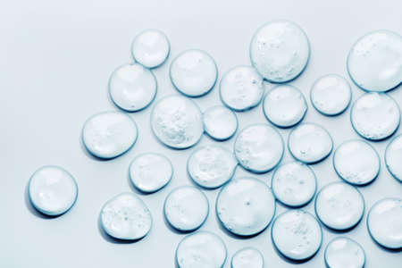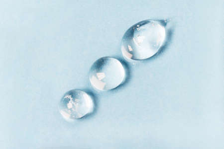 Round drops of transparent serum gel on blue background