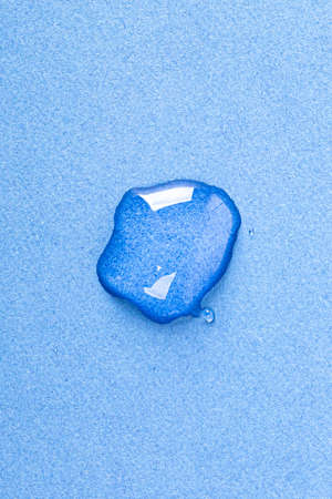 Liquid gel abstract cosmetic swatch drops on blue background. Smear of transparent moisturizing product