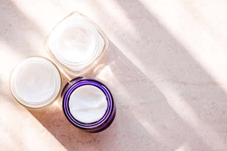 Moisturising beauty cream jars, skincare and spa cosmetics on stone background in summer at sunset, cosmetic product and skin care concept