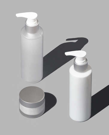 Blank cosmetics containers for mockup with hard shadows on gray background. Body care concept.