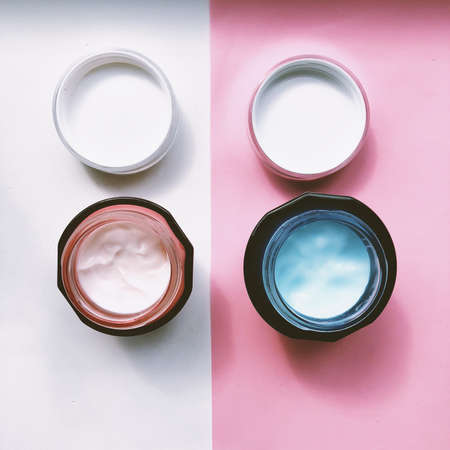 face cream with selective focus. Cosmetics pink and white background