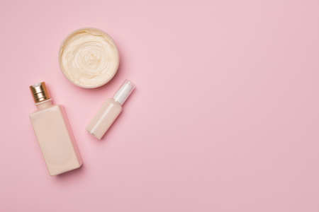 Composition with cosplay products on a pink background with copy space. Tubes and bubbles for cosmetics on a glossy surface.