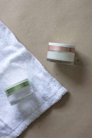 Close up set of cream jar. Two glass skincare cosmetic jars with green and pink lid on towel and beige background. Two moisturizer. set close up of beauty hygiene container on background craft paper