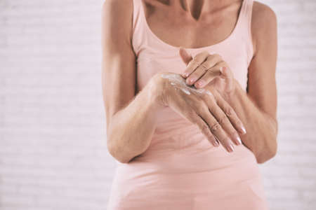 Woman hands applying moisturizing cream to her skin. Soft skin, skincare concept. Hand skincare.