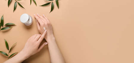 Woman applying cosmetic cream onto her hands against color background with space for text, top view