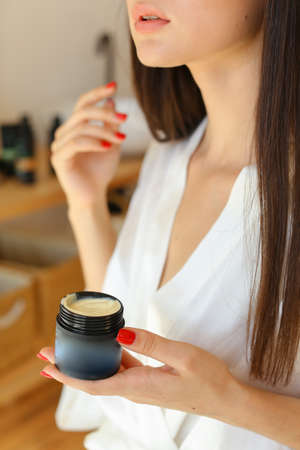 Woman holding open cream moisturizer in glass jar on beige background and copy space, top view. Skin and body care concept