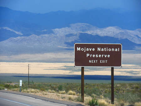 Roadside sign along Interstate 15 in California, with directions to the exit of Mojave National Preserve.