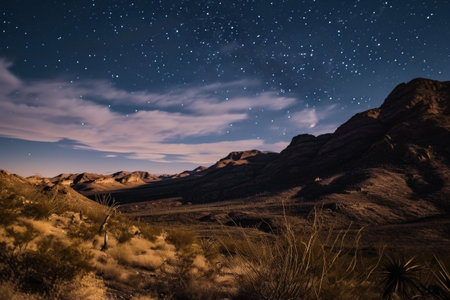 close-up of night sky with stars and moon over desert landscape, created with generative ai