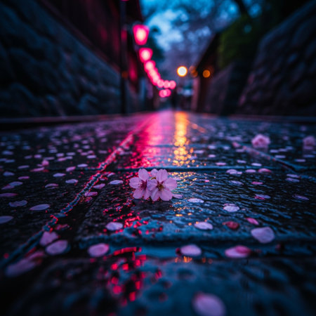 Extreme macro shot of pale pink cherry blossom petals scattered across a wet, smooth black river stone. Cinematic contrast emphasizing fragile beauty.