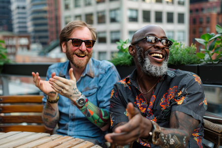 Joyful man in sunglasses cheers with friend on rooftop a captivating friendship moment