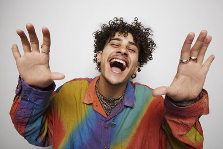 A smiling young man with curly hair enthusiastically raises his hands. The individual wears a colorful patterned shirt, with a neutral backdrop. The composition is a medium shot with even lighting. This image could be used for various commercial or editorial purposes highlighting themes of joy and positivity.
