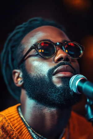 A talented musician, wearing stylish sunglasses and an orange sweater, passionately sings into a microphone. The intimate setting is illuminated with soft lighting, creating an inviting atmosphere that draws in the crowd.