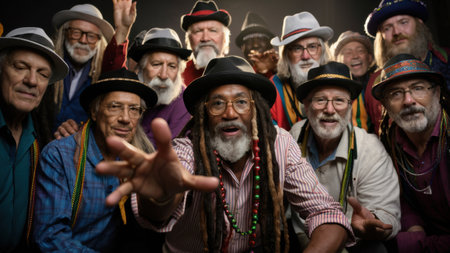 A man with a colorful hat and beard is wearing a multi-colored jacket. He has a serious expression on his face