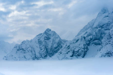 A closeup of a mountain peak covered with fog and snow in the Julian Alps, Slovenia