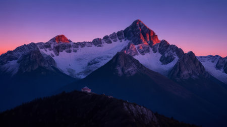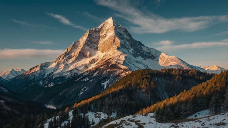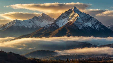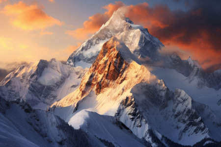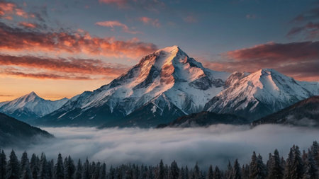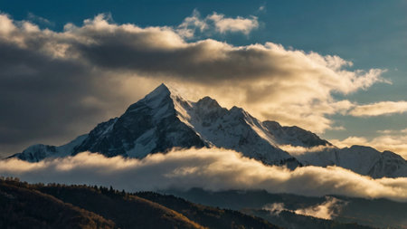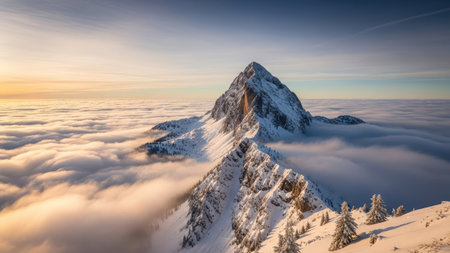 A majestic mountain summit is depicted, its slopes blanketed in snow. The image features a dynamic composition, with the peak piercing through a sea of clouds. The sky displays a gradient of colors from warm to cool hues. This visual could be used in various commercial applications.