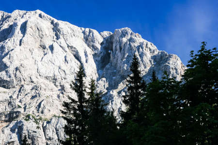 Scenic view of snow capped mountain peaks of Karawanks from Sinacher Gupf in Carinthia, Austria. Mount Hochstuhl (Stol) is visible through dense forest in early spring. Rosental on sunny day. Freedom