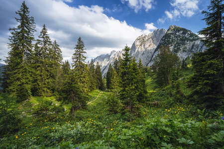 Forest scene with fir trees and Alps mountains in background, Gosau region, Austria