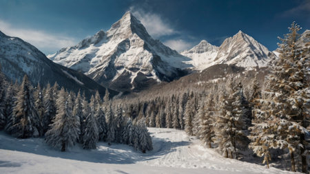 Mountain landscape with snow-capped peaks and coniferous forest