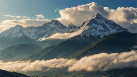 snow-covered peak towering above alpine valley, with clouds floating by, created with generative ai