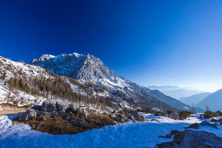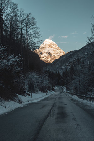 View of Alps in Kranjska Gora at sunrise. The tops of the mountains are covered with snow. Triglav national park. Slovenia, Europe