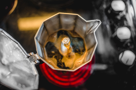 Coffee Moka for Italian espresso. Prepairing breakfast drink. Closeup Traditional Isolated moka at home. Shallow depth of field . High quality photo