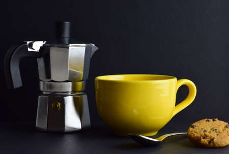 Yellow porcelain cup next to aluminum coffee maker. Black background and copy space.