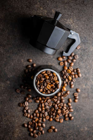 Coffee beans and bialetti coffee maker. Moka pot on black table. Top view.