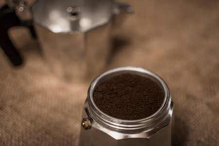 Grinded coffee in aluminium espresso coffee maker pot. Close-up and detail with selective focus.
