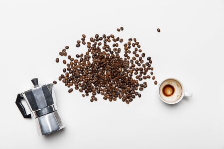 top view of aluminium coffee pot, scattered coffee grains and cup on white background