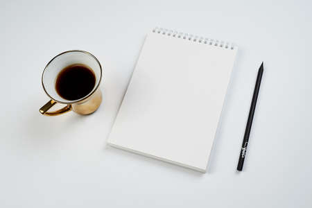 white office Desk top view with Notepad, pencil and coffee Cup, minimalistic design, top view,copy space,flat lay