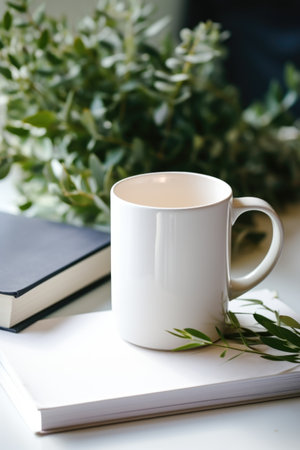 Mockup of a white ceramic mug on a table with books and flowers. White mug close up.