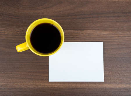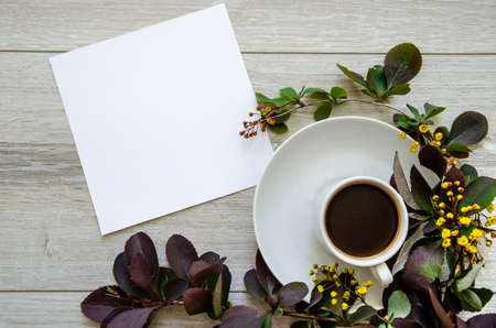 Blank paper sheet copy space with mockup and leaf and cup of coffee on wooden table, poster and invitation, postcard decoration your design or branding, nobody, flat lay, top view.