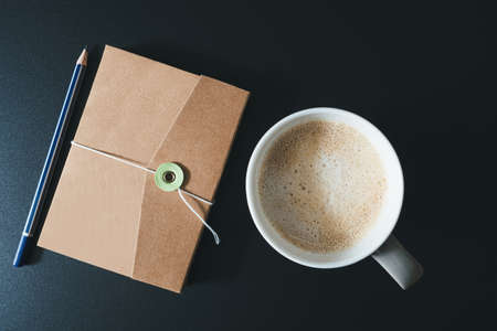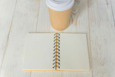 craft paper coffee cup and open notebook diary with copy space on wooden table