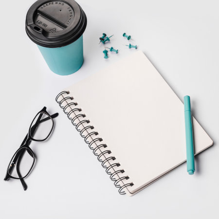 disposable coffee cup pen eyeglasses spiral notepad thumbtack pins white background