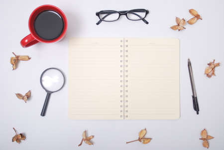 Minimalist notebook on office table desk. Workspace with notebook, spectacle, pen, magnifying glass, cup of coffee, potpourri on white background. Flat lay, top view