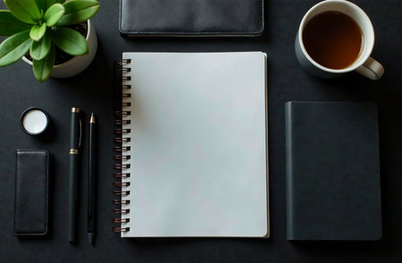 Blank notepad on black work desk witc copy space. Surounded by office supplies, phone, glasses, coffe mug, plant. Low light business composition